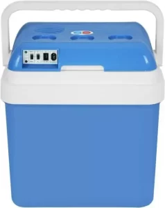 This 24-liter car fridge has plenty of room for food and snacks and can hold roughly 30 soda cans or a large 2-liter bottle. A retractable divider is used to make creating and organizing two divisions easier. It has a mirror on the front side with a light that will tell you about the temperature.